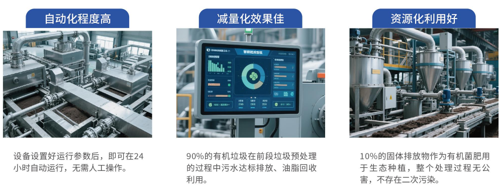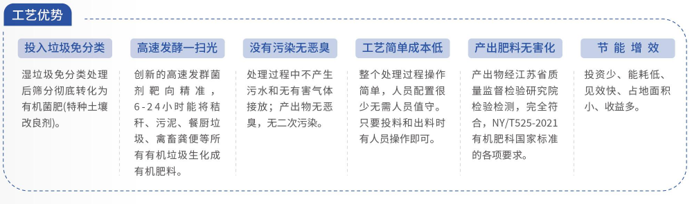华豪公司自主研发制造的智能型有机垃圾处理设备,工艺流程简单、高效、混垃圾无需分类,可直接通过输送装置投入设备处理仓内,按比例添加菌剂,根据处理物的不同类型,通过可视化液晶触摸屏对设备进行水、气体排放,餐厨垃级中的油脂可直接进行生化处理,高效发酵,24小时内就可把有机垃圾减量85%左右,剩余产出物为有机菌肥,经权威部门检测产出物各项参数指标完全符合NY/T 525-2021行业标准要求。